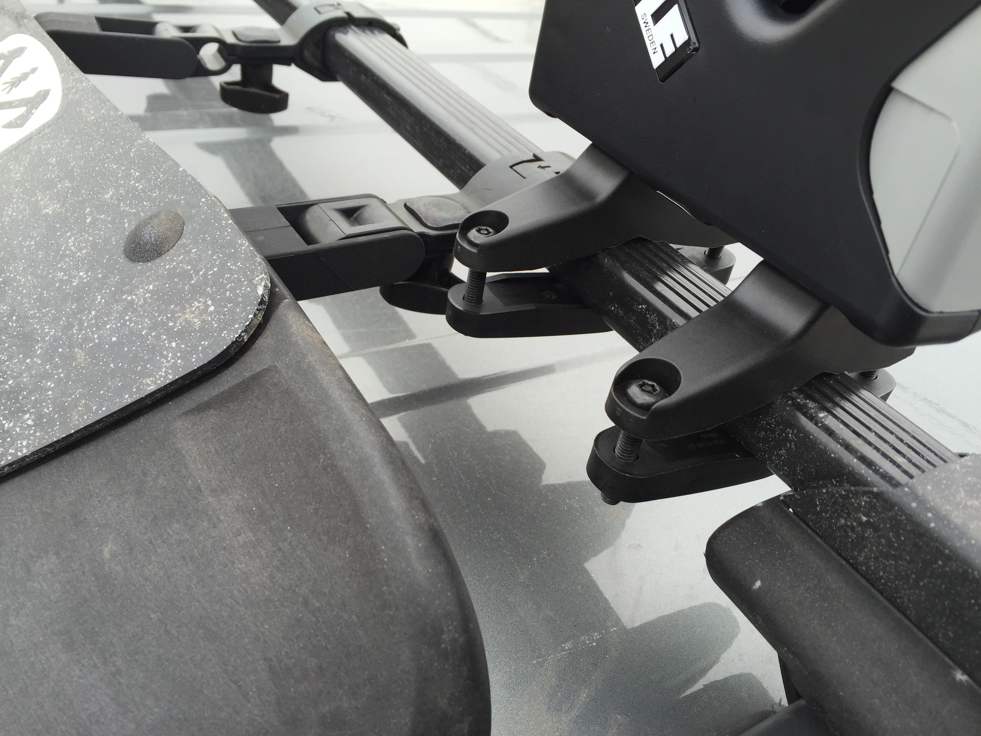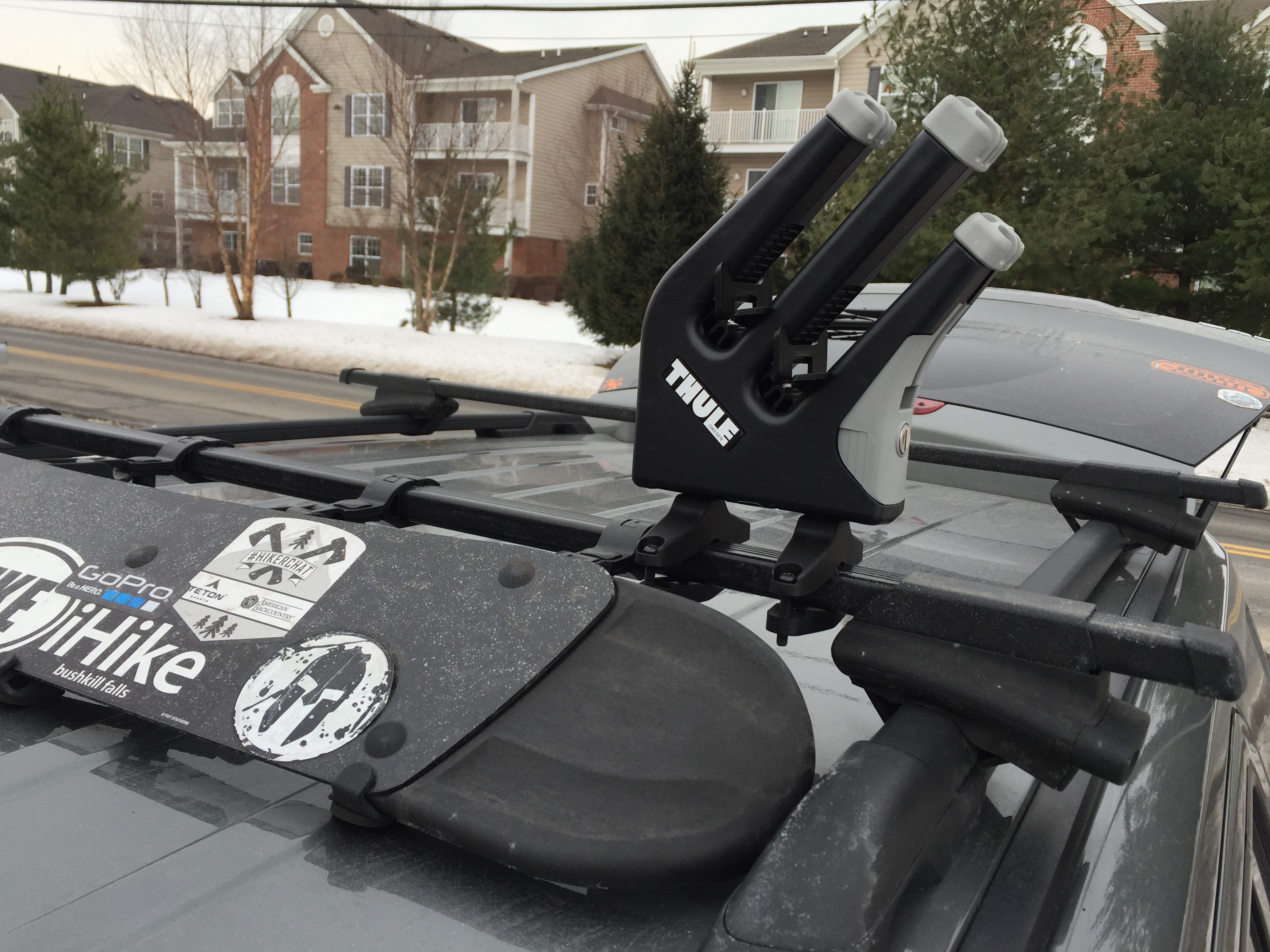 The rack will work with Thule square bars, Thule aero bars, and likely any other similar crossbar – mine fit nicely between the first faring mount and the end of the square bar. Make sure that the angled snowboard holders are pointing towards the outside of the vehicle – it could be quite tricky the other way.