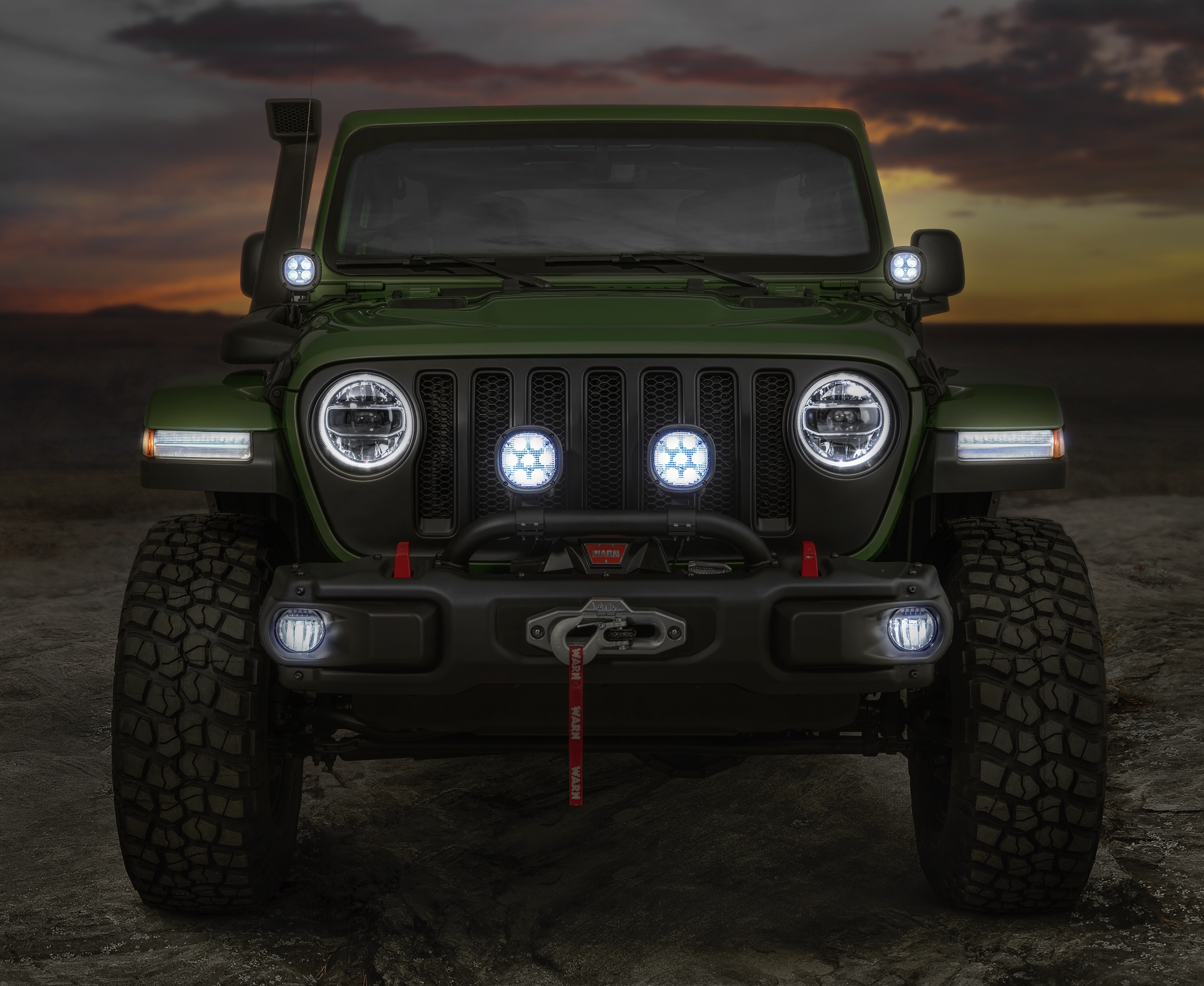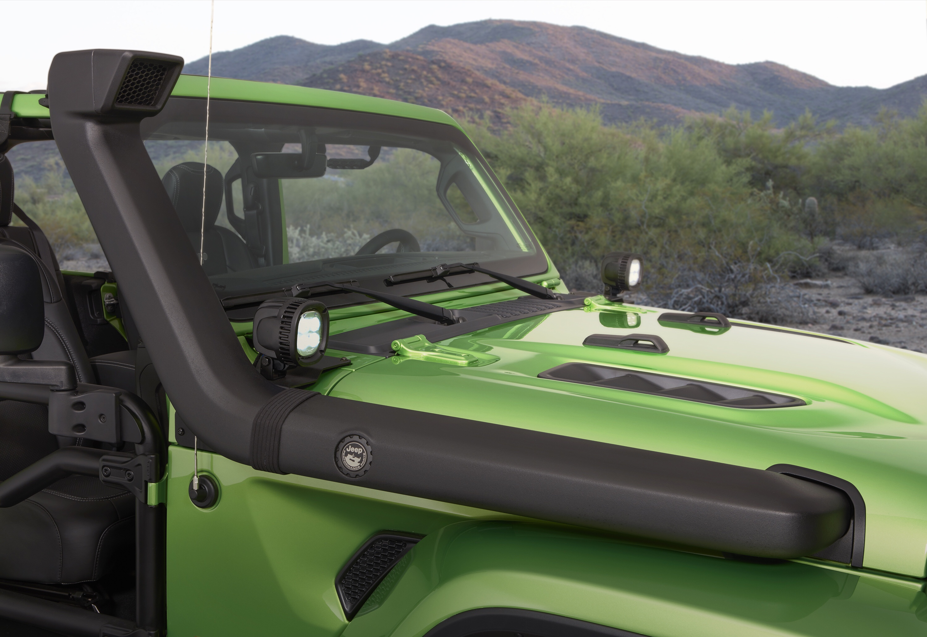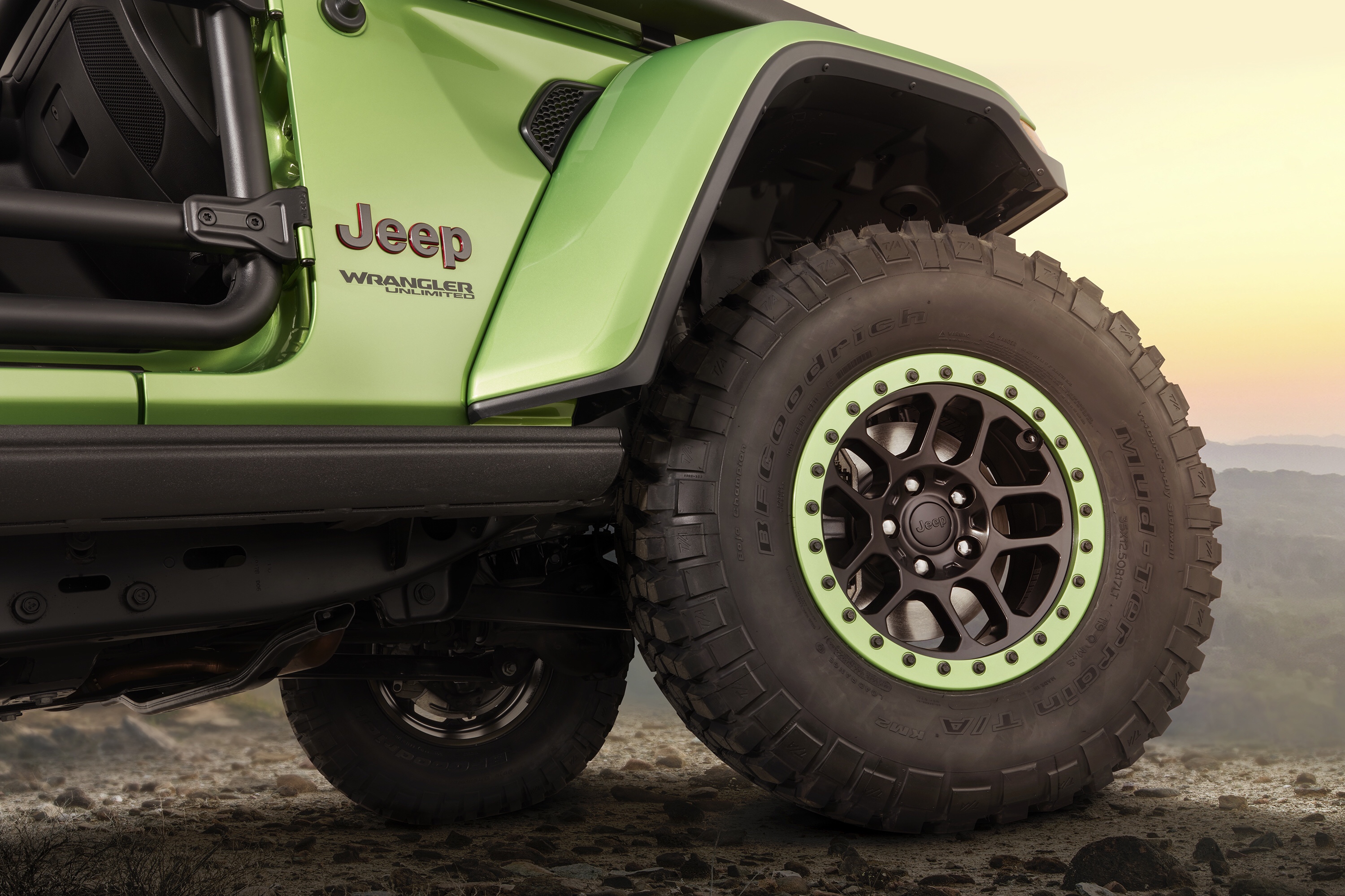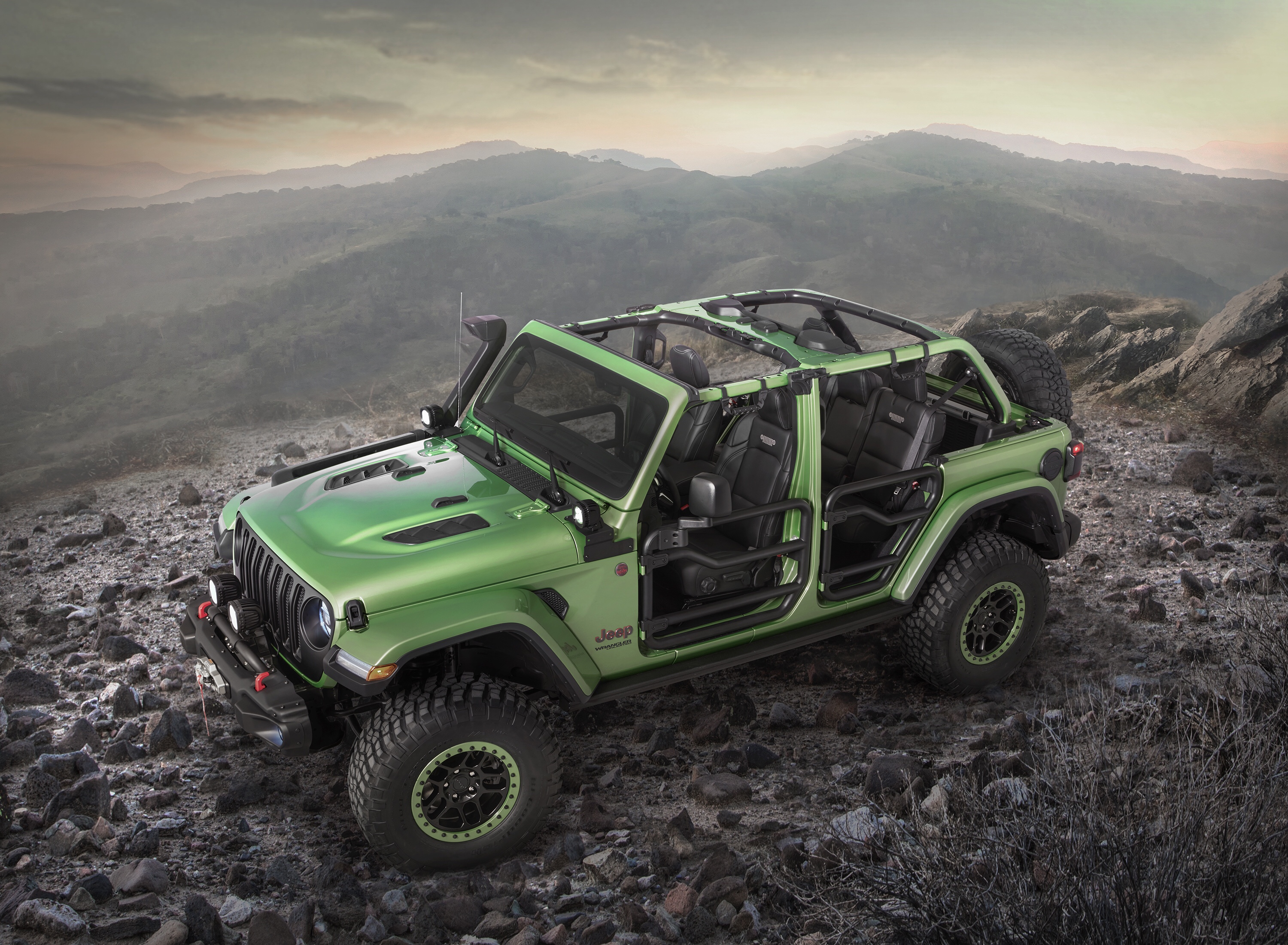 Sporting Mopar’s lift kit, bead-lock wheels, winch bumpers, trail doors, snorkel and lighting, the JL looks great on 37″ BFG KM2s.
